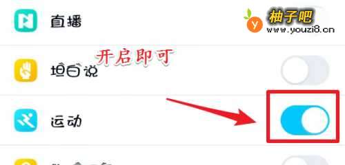 7点击图标进入相关界面以后。在界面的功能列表中找到“运动”选项。最后将该项设置为开启状态即可。
