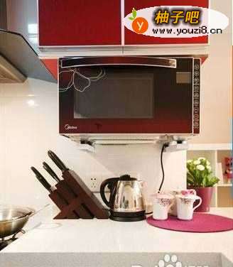 3在吊橱下安装了搁板,将微波炉摆放其上,借取了纵向的空间。这样台面上就能放上电水壶、刀具、情侣杯等小东西了。