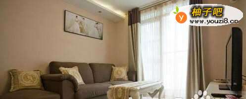 8客厅的整体布置显得宽敞大气,采用了淡雅的色调。大大落地窗,形成了极好的采光。松软厚实的深色沙发,让人倍感舒适。抱枕和茶几上的台布复古花纹,提升了居家的品质感。墙上正是小夫妻俩的婚纱照,美满而甜蜜。