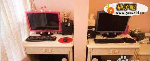 12在两台电脑上,分别包上红色和黑色的卡通套边,依然成为一对情侣电脑。用沙发椅取代普通转椅,增加了房间的温馨感,放桃红色的爱心靠垫,增添一抹浪漫的情怀。
