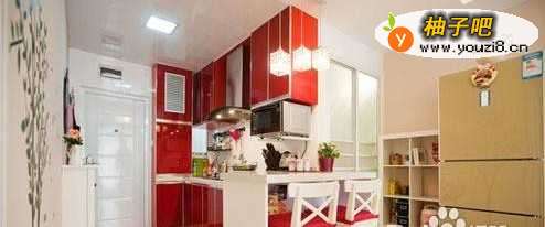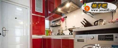 2门的右边就是厨房了,将其设计成了开放式,在视觉上让你感觉十分的宽敞。红色系的橱柜,也增加了婚房的喜庆的气氛。红色的烤漆面,很是亮眼。嵌入式洗衣机,合理地利用了空间。