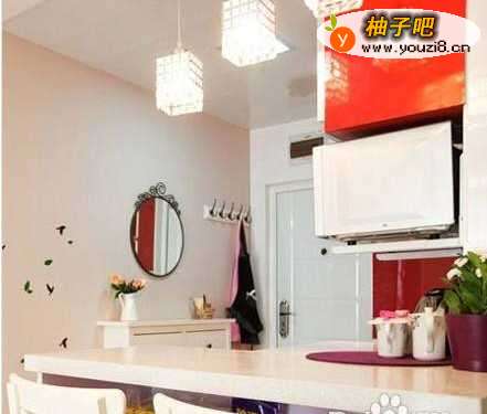 4利用厨房的一旁定做一个小吧台,这样就能成为小夫妻的就餐区域了,高吧台的设计,在下方做上搁板就能成为收纳的空间,椅子上的软垫,增加了舒适度。