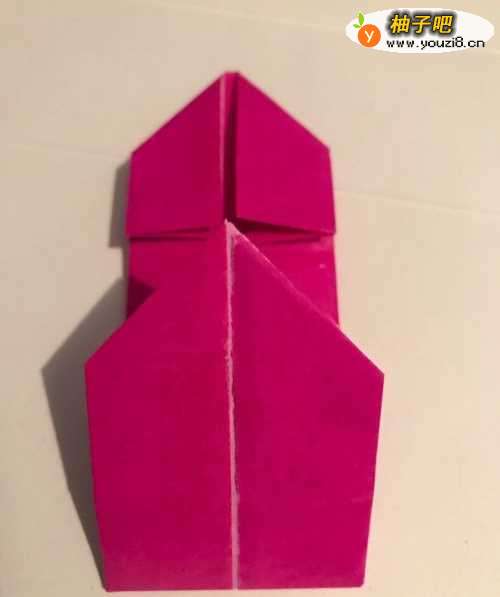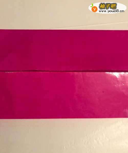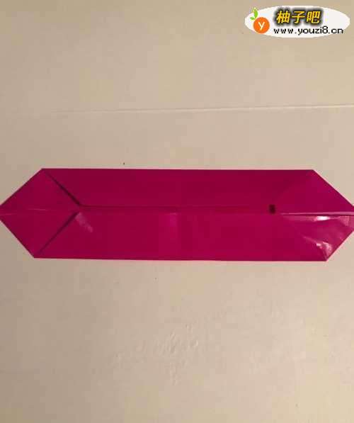 第一步 取一张边长为16厘米的正方形二红色彩纸 先把它从下向上对折取开 然后再拿起上下两个角 都向里折叠在中线