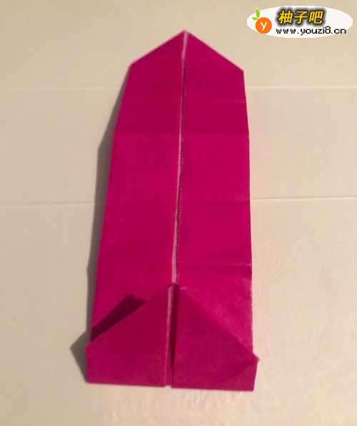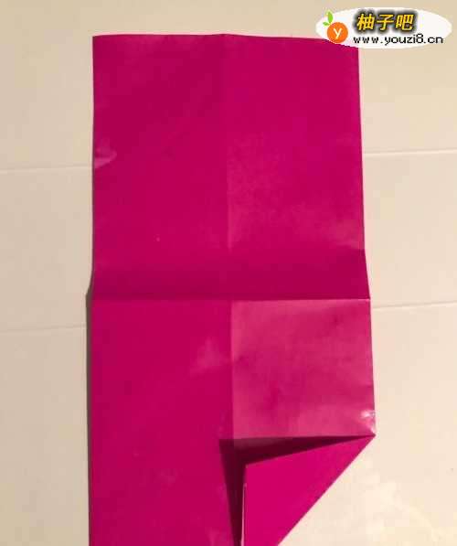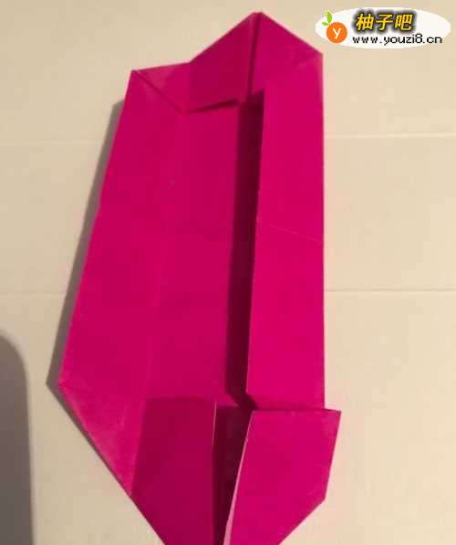 4第四步 上下两边都折至中线之后 再把它竖起来 下头取开一下右下角 然后按折痕把心形的半成品折到外面