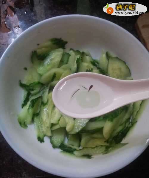 3倒掉碗中腌渍出来的水,加入两小勺醋和四到五勺糖,拌匀,腌制一小时即可食用。