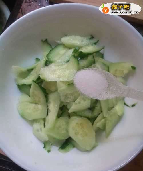2将适量盐均匀洒入碗中,上下抛动,待盐与黄瓜片拌匀后放置五分钟。