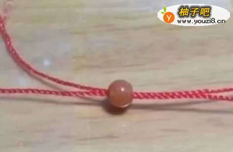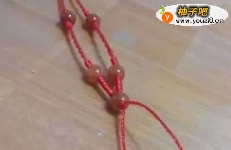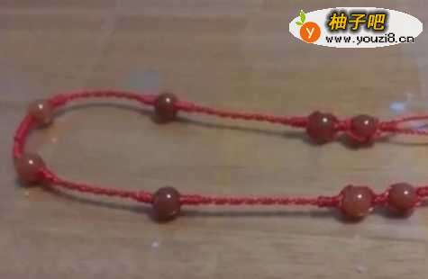 6在其对称的中线点用一根短线固定,也可以稍加编制下,把最后一颗珠珠穿上,这个可以根据个人的喜好来编制。最后可给自己编好的项链添加一个漂亮的挂坠即可,这样一个漂亮的红绳项链就编好了。