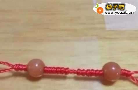 2编好之后,在两边各加1颗珠珠,再接着往后编3个蛇结,编的时候要尽量编实,不要松垮。