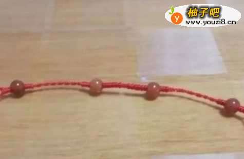 4接着2根线对穿过1颗珠子,编2个蛇结之后再对穿一颗珠珠,再编制3个蛇结。不要忘了两边要一起编,要对称哦。