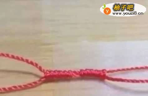 我们首先取120厘米长的红绳2根,取其中间的点,以中线点开始,分别向两边编制,各编6个蛇结,左右要对称。