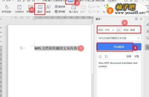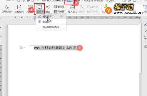 3在“审阅”菜单功能区,选择【翻译】—【短句翻译】;