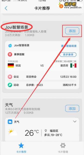 5在卡片推荐里,下拉找到“Jovi智慧场景”,点击“添加”。