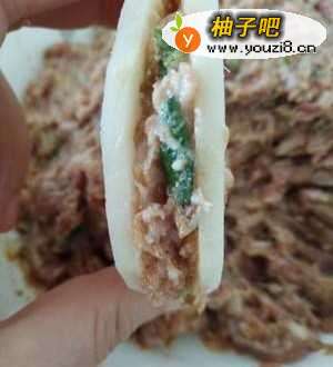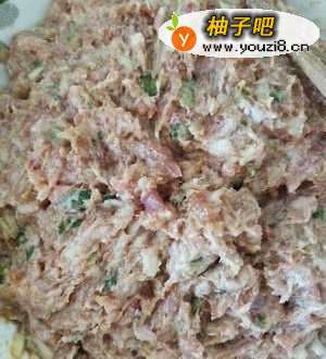 五花肉打成馅,加入适量葱、姜、香菜、食盐、胡椒粉,搅匀备用。