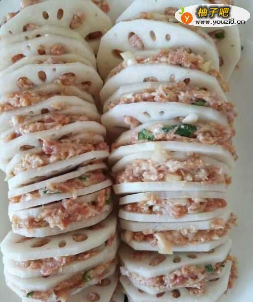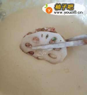10油烧至六成热,放入挂糊的藕夹,炸至金黄。