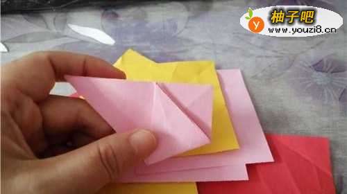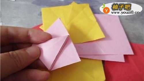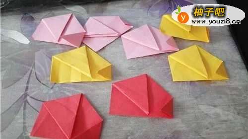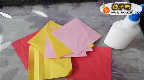 4按照上面的步骤把其他彩纸折好,如图一。再把它们用手工胶固定下,如图二。