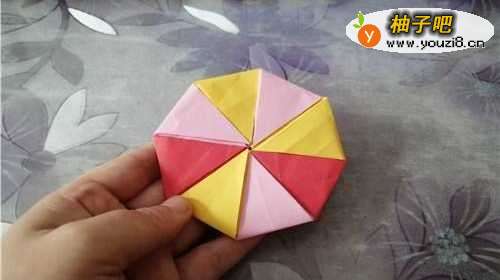 下面我们一起来折一个很实用的茶杯垫,从外观来看,有点像是我们常吃的棒棒糖。它是由八张正方形的纸折好后,组合而成的,过程很简单,适合初学者练手。