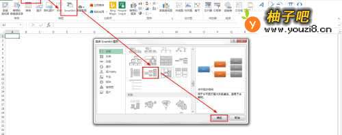 设置整个工作表的颜色填充为白色或设置无网格线——插入——SMARTART——选择水平层次结构的图形——确定。