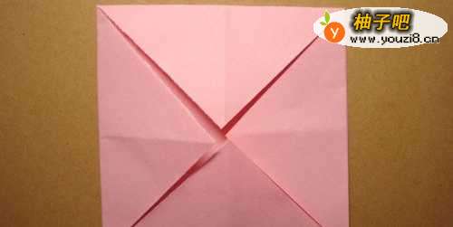 把准备好的一张粉红颜色的彩纸,用手沿着折痕,裁成正方形,选择90度,把四边三角形纸边,向中间平均折一次,平放在桌面上,如下图所示。
