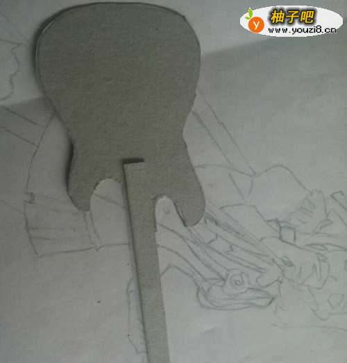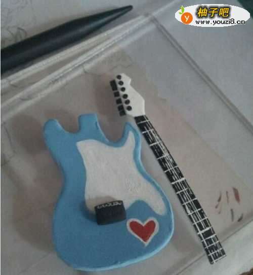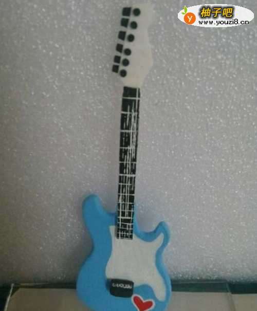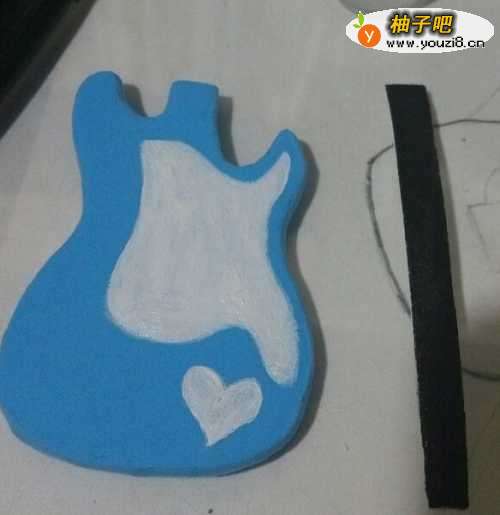 4粘在吉他的琴头上。(我先做了这步导致画白线很辛苦),两个组合起来,完成。(蓝色要厚,白色要薄)。