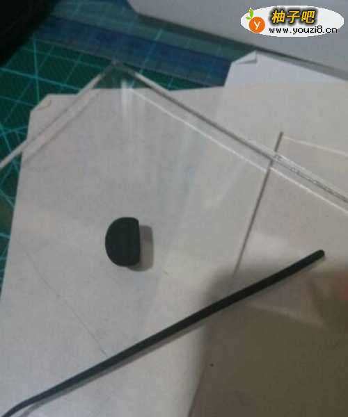 3用针沾白色丙稀在扁圆上戳一排共六个孔,再剪成长方形用发丝沾白色丙稀,在黑色的长条上画出吉他弦等长条剪六小段加六个小圆片。
