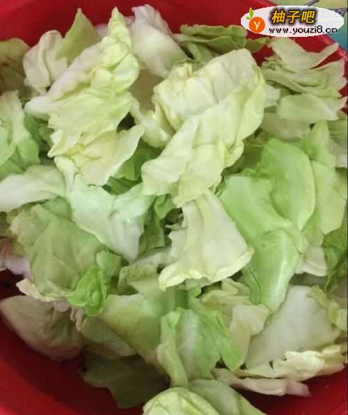2泡洗干净后,沥干水分,把包菜用手撕小块,不要用刀切,手撕的感觉比刀切的好。