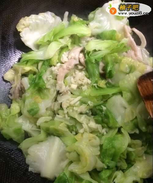 5这时包菜已经熟了,炒包菜可以根据自己的口味来定,喜欢脆的就少炒几下,喜欢软烂的就多炒几下,然后放入切好的蒜碎,继续翻炒几下,闻到蒜香味就可以关火了。最好不要再放什么调料了,吃原味最好。