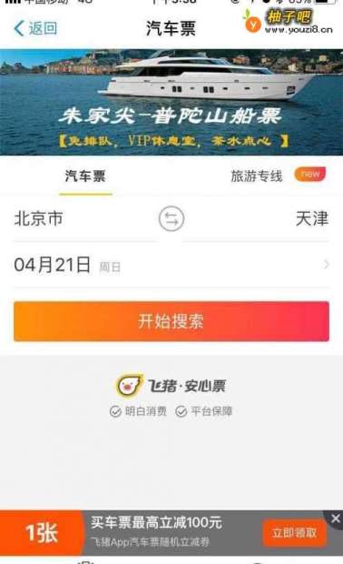 6点击汽车票,选择起点和终点以及出发的日期,见下图