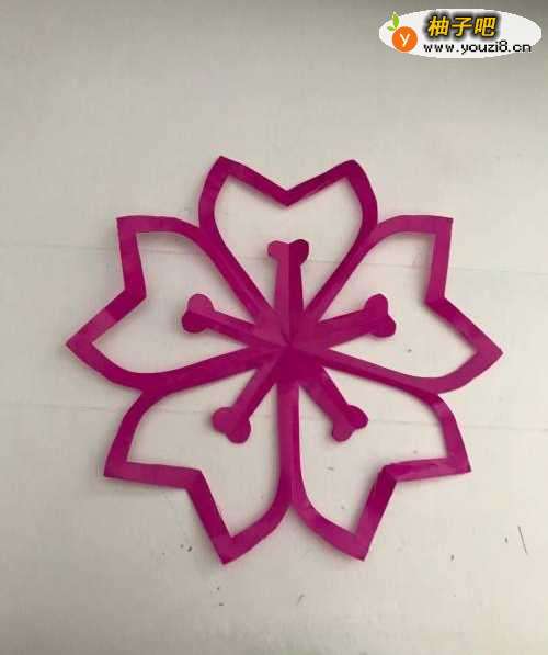7第七步 剪完外围多余的彩纸之后 再剪里面的花蕊部分 轮廓部分还有其它涂实的部分等等 全部剪完之后 展开压平 一朵简单又漂亮的樱花就全部完成了