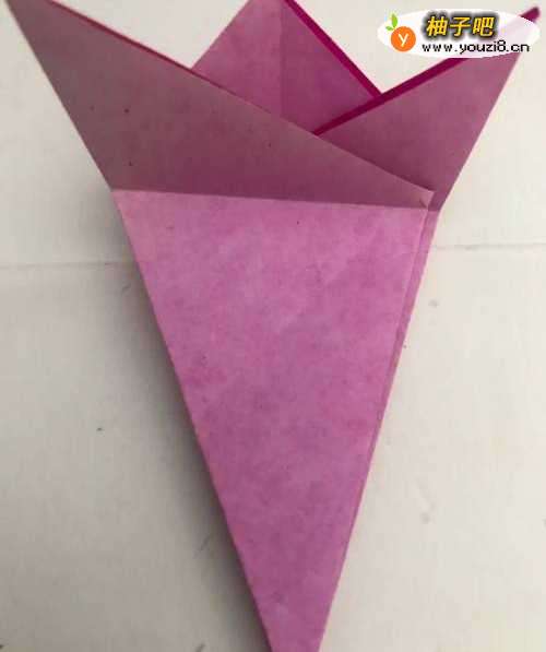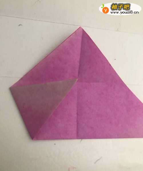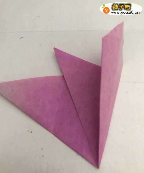 4第四步 折好之后 再把左边部分的三角折向背面 然后调整一下 把上头最低的的那页彩纸向下折一道折痕