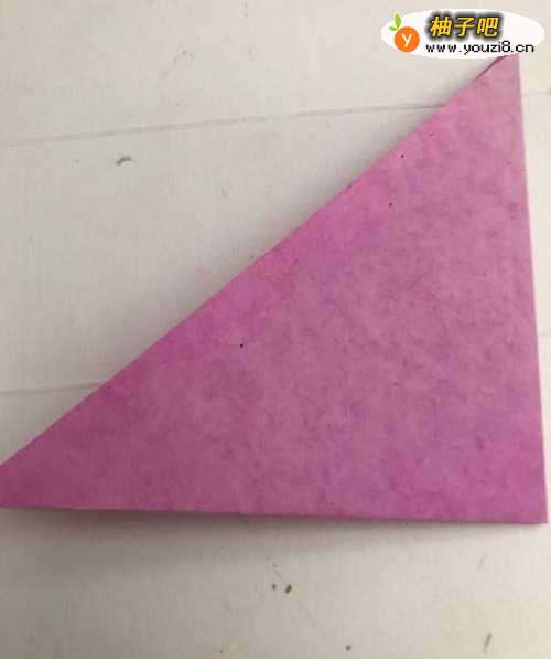 第一步 取一张边长为16厘米的正方形二红色彩纸 先把它从下向上对角折叠 然后再从右向左对角折叠
