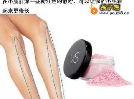 5怎样使小腿看起来更修长?在小腿处涂抹粉红色的散粉,会有意想不到的效果。