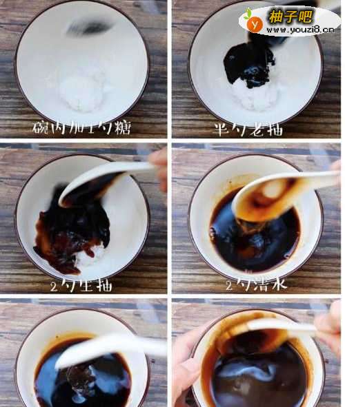 3碗里加入一勺糖,半勺老抽,生抽清水,甜面酱调成我们的酱汁