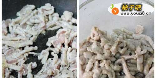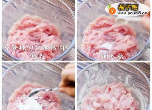 2肉丝把清水全部吸收以后加入盐,再加入淀粉抓匀备用