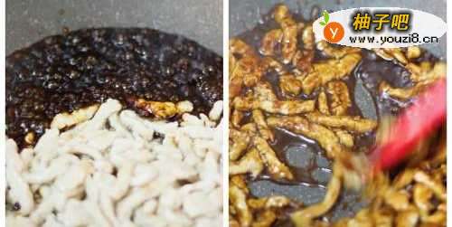 7翻炒浓稠以后呢,再倒入肉丝,翻拌均匀