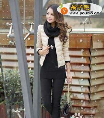这款杏色短棉衣打破了棉服臃肿的常规印象,搭配黑色长款的黑色针织衫毛衣和黑色紧身裤更加显瘦,黑色的围脖增加了层次感。修身又显瘦的搭配简洁又大方。