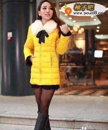 5明亮的黄色长款羽绒服,时尚的白色大毛领系上蝴蝶结可爱又俏皮。袖口的蕾丝很是漂亮,像上世纪欧洲贵族般优雅,下身搭配高筒靴露出修长的美腿迷倒路人。