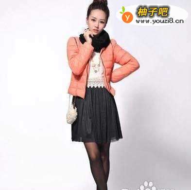2温馨浪漫的粉色棉衣透露出甜美可爱的气质,内搭黑白拼接的连衣裙,女孩子的千般柔情轻松演绎。天冷时戴上时尚的围脖把脸显得娇俏可爱。
