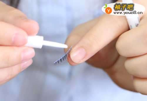 7等待20~30秒后,将假睫毛靠近睫毛根部黏住,偶尔胶水没涂够不够粘的话,可以在稍微涂一点~