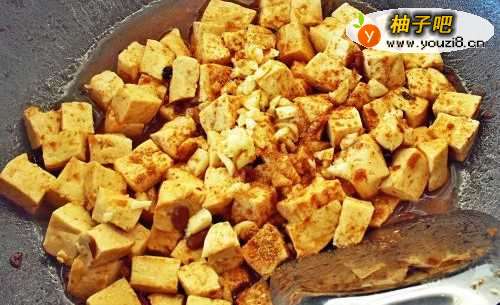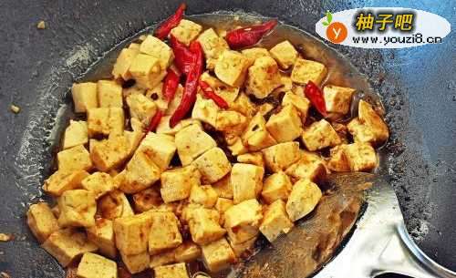 5然后倒入适量的豆瓣酱炸一下锅,倒入焯好的豆腐块,翻炒一下,使豆腐表面均匀的沾上酱汁。