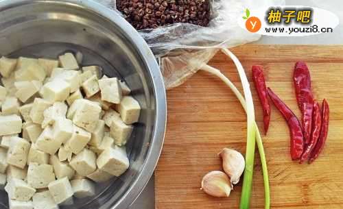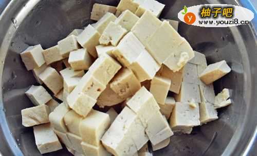 准备嫩豆腐一块(小编用的是北方的卤水豆腐。),把它切成边长大约1cm的小正方体,装进洗干净的小盆里诸付八。