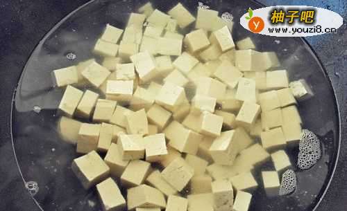 2锅清洗干净,加入少许的盐,点火加热,等到水开了,倒入切好的豆腐小块过水焯一下,用漏勺捞出来备用。