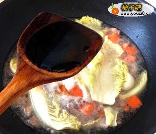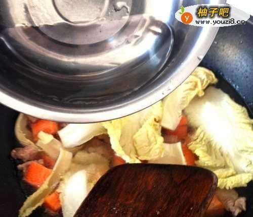 4把肉炒熟,倒入胡萝卜和白菜,加一碗水炖煮。