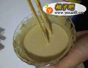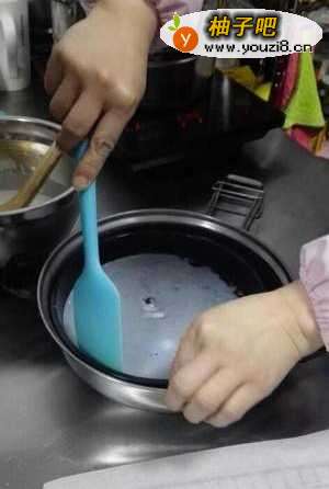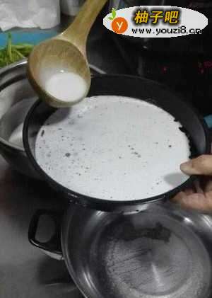 7水烧开后,开始只做凉皮了,用勺子盛上面糊倒进刷好油的披萨盘里,铺满
