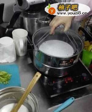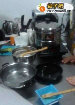 4蒸锅做上水,再准备一盆凉水,披萨盘里刷上一层植物油