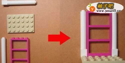 2这里,先搭建化妆柜的模型的底座部分,由两个支架积木和门的所组成。左边是拼装所需的零件,右边是拼装好后的整体结构效果,如下图所示。