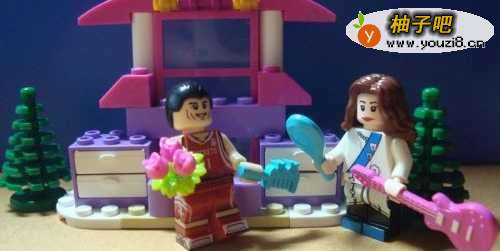 6最后,把拼装好的搭建化妆柜的模型与绿色植物积木摆放在一起,并搭配上两个积木人物,看正面的整体效果,如下图所示。这样就制作好了化妆柜的模型,大家按照步骤,也来做做吧。