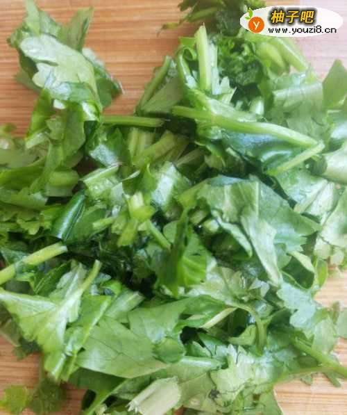 6十分钟后,香菜切碎,加入锅中。