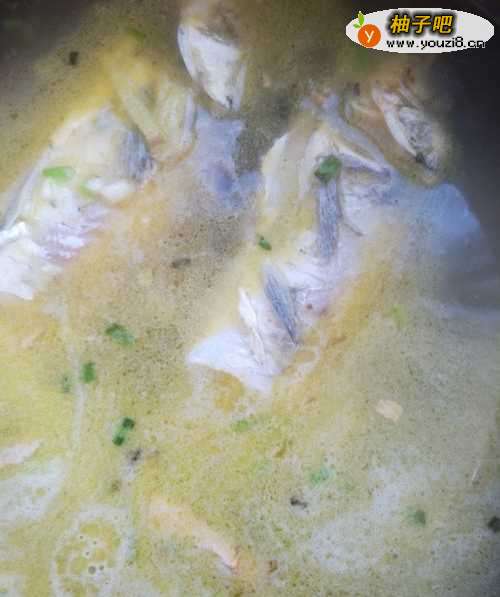 2锅中倒入适量豆油,把鲫鱼下锅略煎一下,加入葱姜,鲫鱼两面煎至鱼眼发白即可。