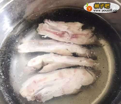 2把猪脚洗净之后,冷水加料酒下锅飞水两次至无浮沫后即可捞出来沥干水分备用!