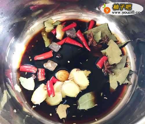 3锅中下辣椒,姜片,八角,小茴香,香叶,生抽,老抽,盐,红糖,冰糖,微微煮开后加热水,下洗净的猪蹄,煮开后转小火炖煮一个半小时后捞出。